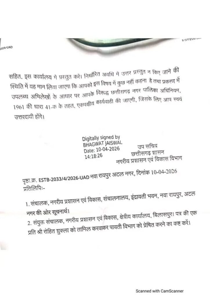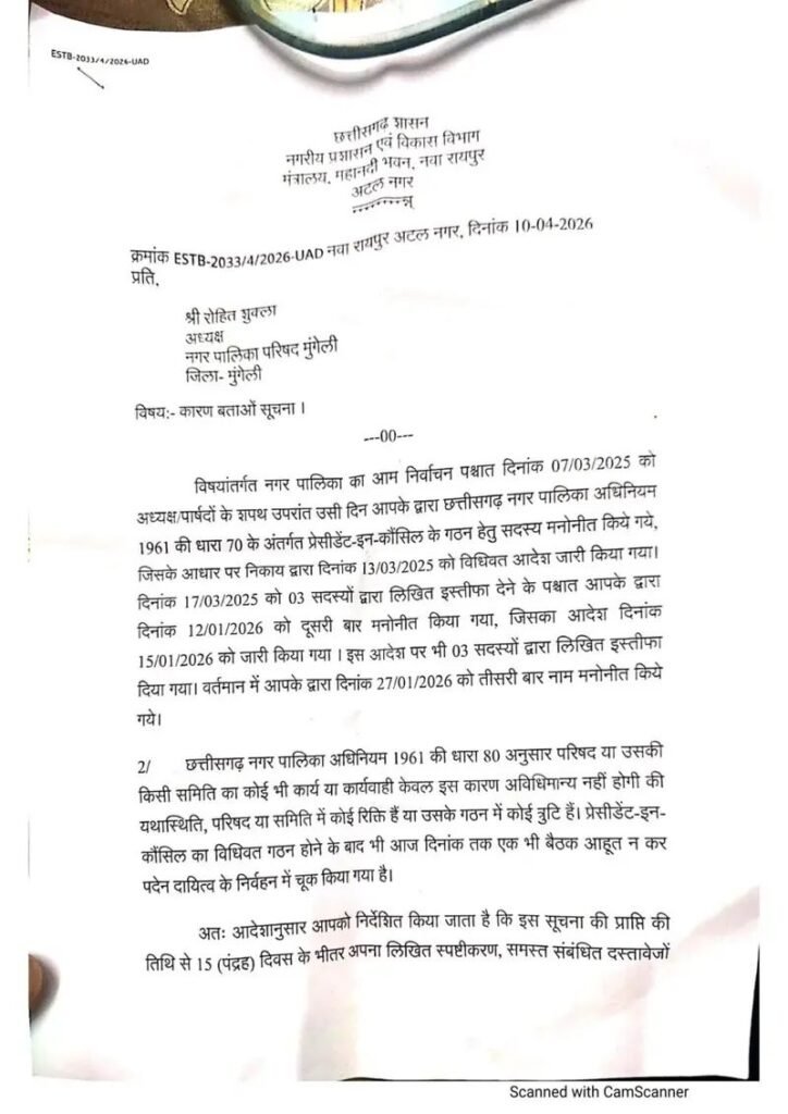 मुंगेली / नगरीय प्रशासन एवं विकास विभाग, छत्तीसगढ़ शासन द्वारा जारी कारण बताओ सूचना के बीच नगर पालिका परिषद मुंगेली के अध्यक्ष रोहित शुक्ला ने बड़ा और स्पष्ट संदेश दिया है। उन्होंने कहा है कि वे जनता के हक और विकास के लिए किसी भी स्तर तक संघर्ष करने को तैयार हैं, और यदि इस लड़ाई में उन्हें जेल भी जाना पड़े तो उससे भी पीछे नहीं हटेंगे। उनके इस बयान ने न केवल प्रशासनिक बल्कि राजनीतिक हलकों में भी हलचल तेज कर दी है।